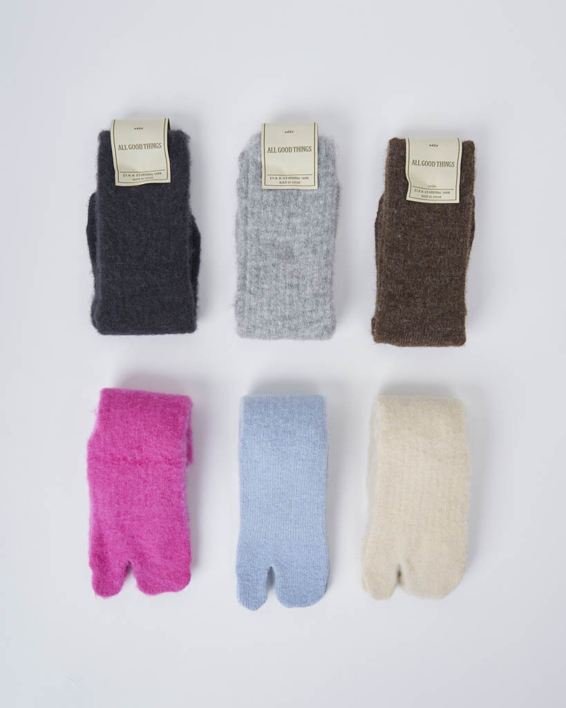 ALPACA TABI SOCKSod243-0802COLOR: BROWN/L.BLUE /CREAM/C.GREY/PINK/GREYMATERIAL: Baby Alpaca,NylonPRICE:¥3,300Made in JAPAN 0404 0603 243-0801 0401 0109 231-0420 0203 0502JP 0407 0602 0105 233-0701 0606 0108 0503 253-0803 0101 0204 0405 0104 0107 0206 od-0501JP 0605 0408 0604 0205 0403 0402 0202 0106 0103 0201 0102 0601